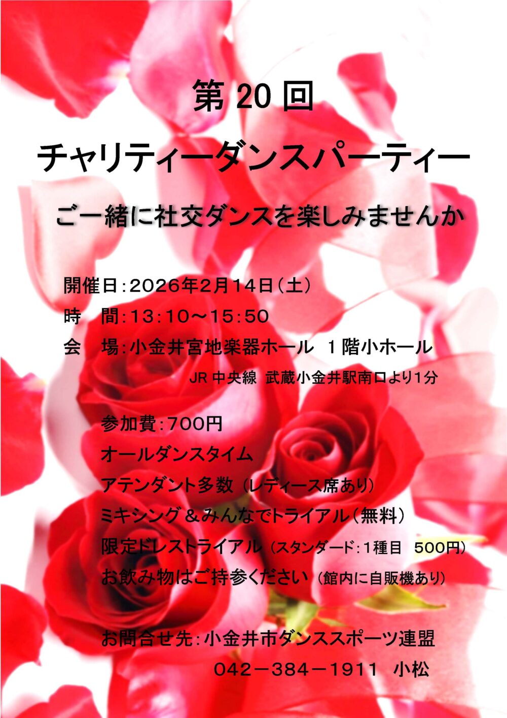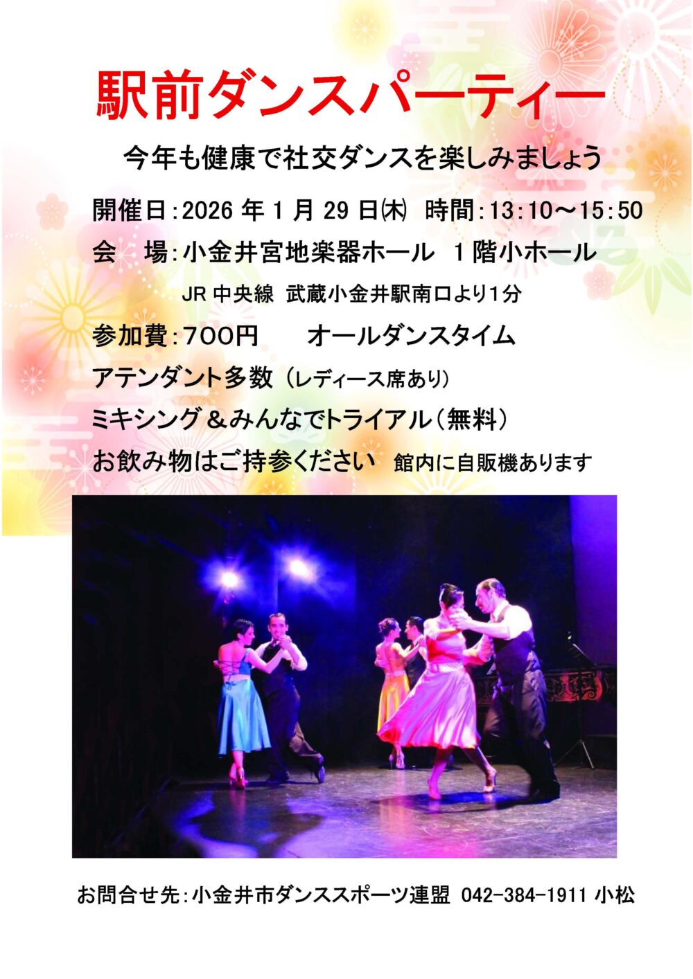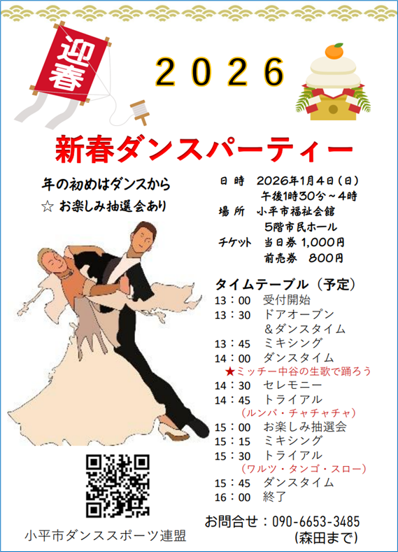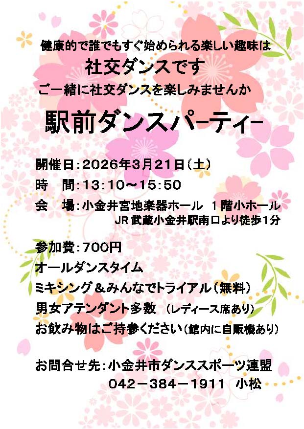 13:00~16:00 前売 800円、当日 1,000円 ダンスタイムあり, トライアルあり, ミキシングあり, アテンダントあり お楽しみ抽選会、飲み物、ボーカル演奏あり 前売り券ご希望の場合は下記HPよりお問合せ下さい。 小平市ダンススポーツ連盟 森田090-6653-3485 https://kodaira-dsf.jimdofree.com/ |