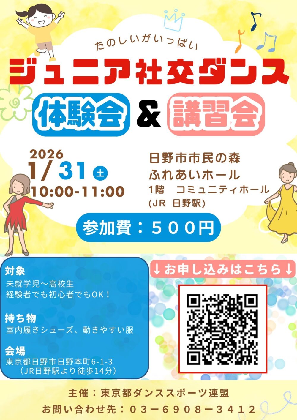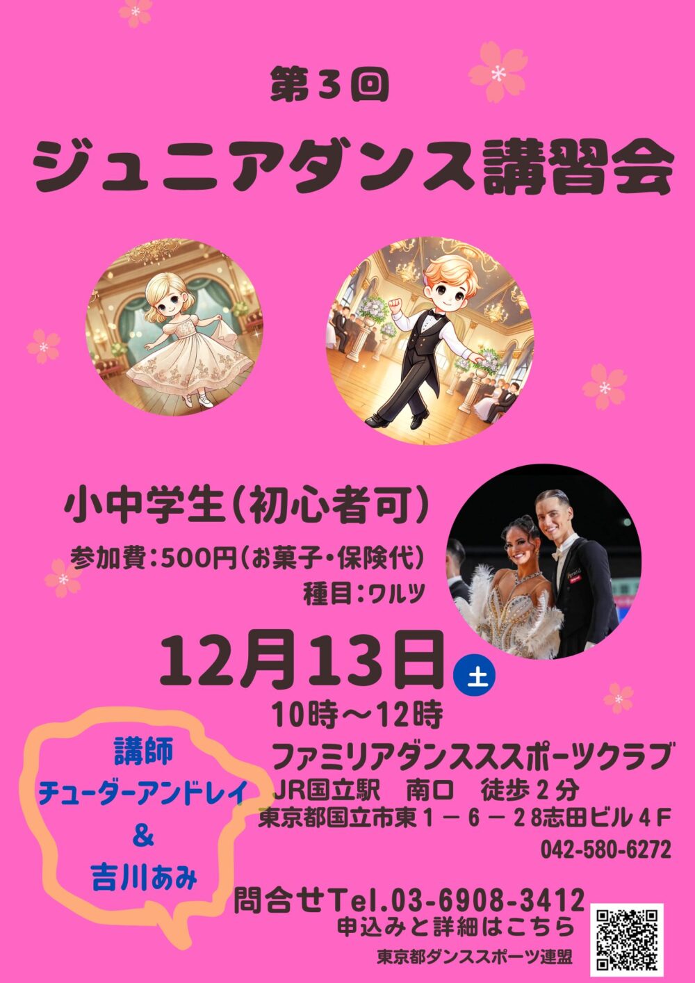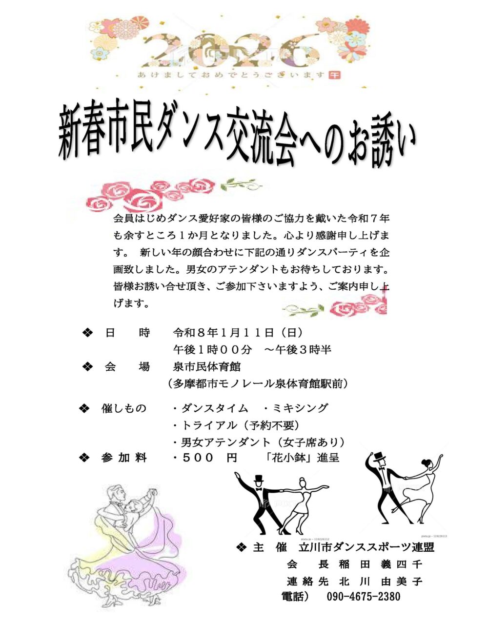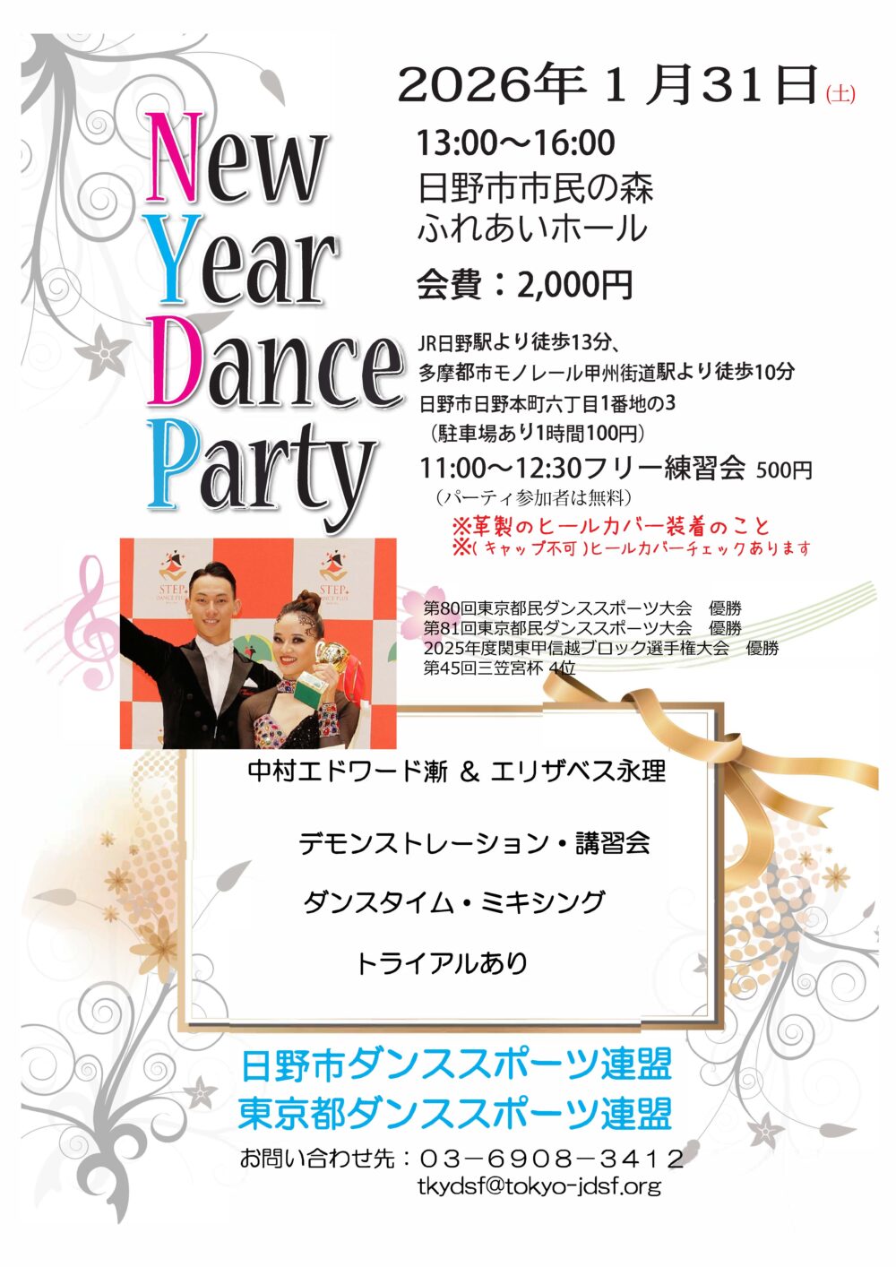 13:00~16:00 2000円 中村エドワード漸&エリザベス永理組によるデモンストレーション、講習会あり ※11:00~12:30 フリー練習会あり フリー練習会はパーティ参加者は無料 フリー練習会のみの方は500円 主催:日野市ダンススポーツ連盟 東京都ダンススポーツ連盟 お問合せ先:03-6908-3412 お申込みはこちらより↓ https://forms.gle/fBusyY7dkJAEe7zE6 |