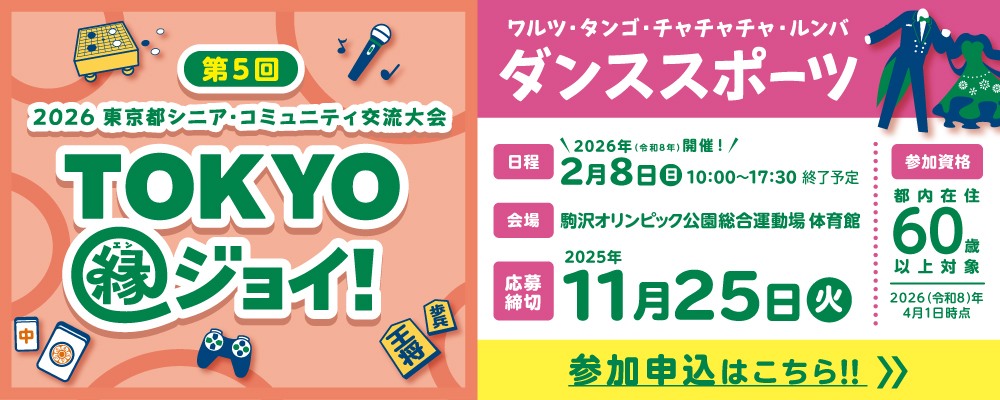 1本大会では、個人戦の各部門の上級で決勝に残った上位1組は、「ねんりんピック彩の国さいたま2026」の東京都代表として出場する権利を得ることができます。競技内容、競技方法、競技規則については本大会の上級個人戦に則り実施します。 2「ねんりんピック彩の国さいたま2026」への出場資格は、2026(令和8)年4月1日時点で満59歳以上でリーダー、パートナーの両方が都内に住民登録されている方。 「ねんりんピック彩の国さいたま2026」の詳細はこちら > |